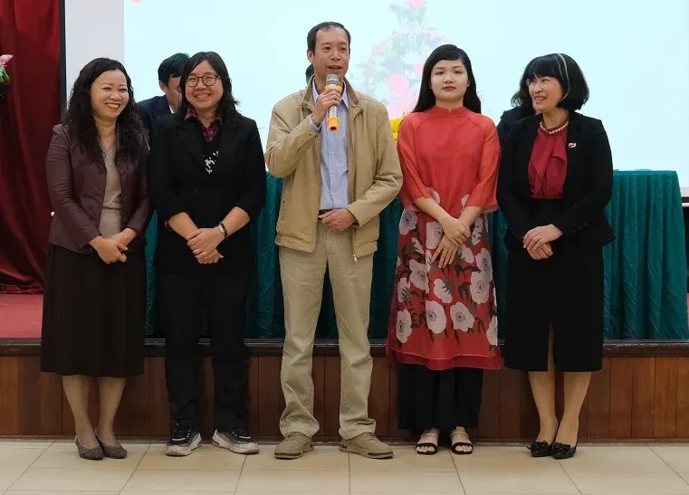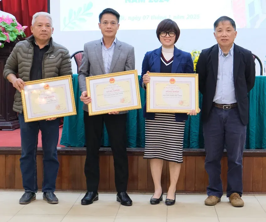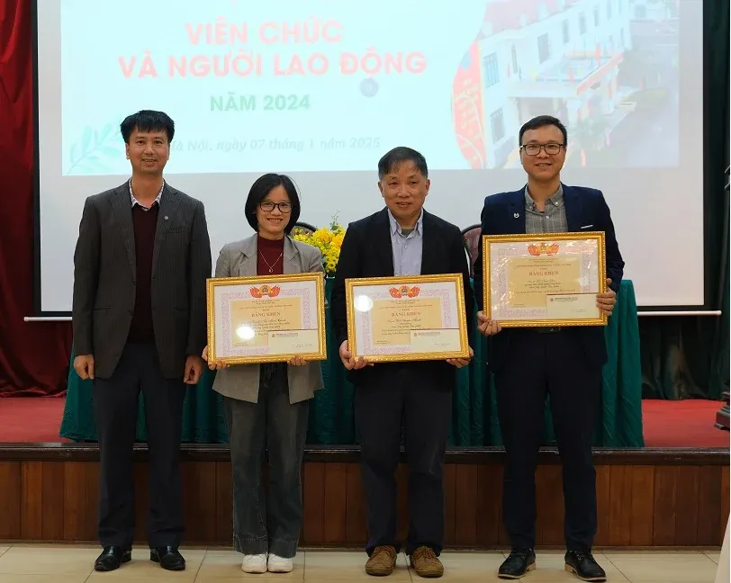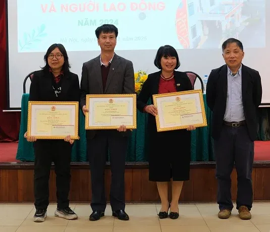 PGS. Vũ Nguyên Thành trao Bằng khen của Tổng liên đoàn Lao động Việt Nam cho TS. Nguyễn Mạnh Đạt, Ths. Đặng Thu Hương, Ths. Bùi Thị Hồng Phương