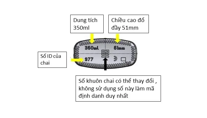 Chúng cũng sẽ có các dấu hiệu sau ở đáy chai – ba dấu hiệu nhận dạng được đánh dấu sẽ không thay đổi (vị trí hoặc chi tiết)