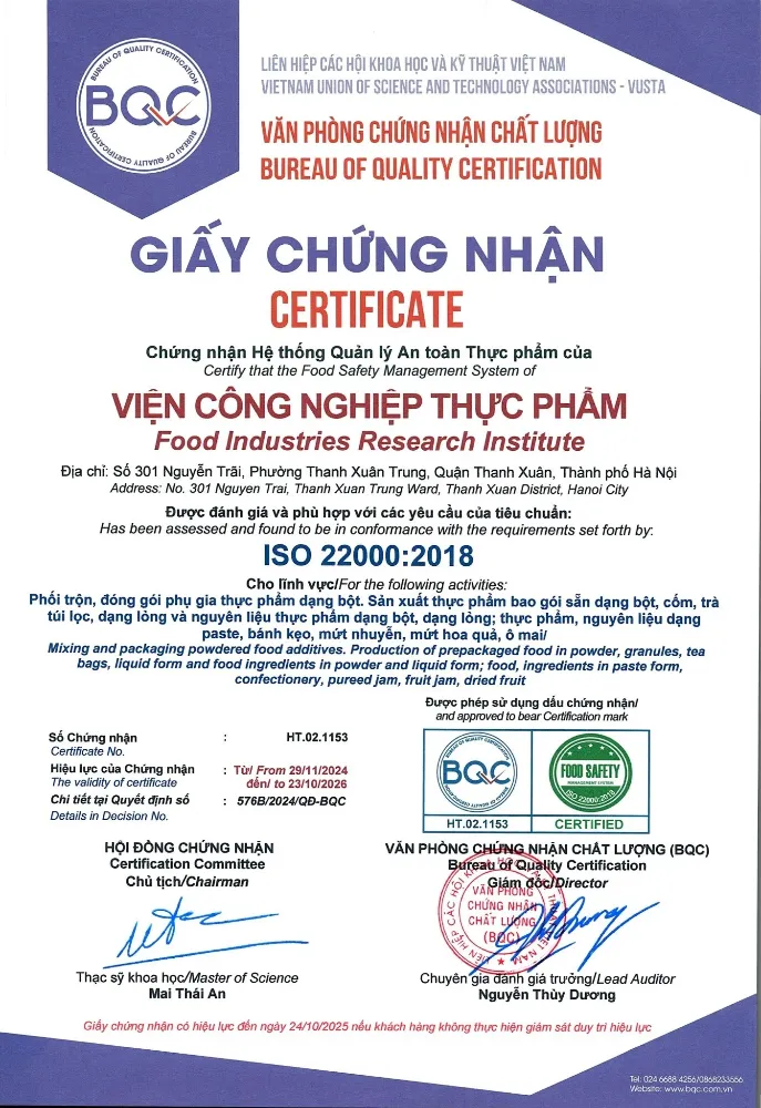 Viện Công nghiệp thực phẩm đã được cấp Giấy chứng nhận hệ thống quản lý ATTP – phù hợp với các yêu cầu của tiêu chuẩn ISO 22000:2018: Phối trộn, đóng gói phụ gia thực phẩm dạng bột, sản xuất thực phẩm bao gói sẵn dạng bột, cốm, trà túi lọc, dạng lỏng và nguyên liệu thực phẩm dạng bột, dạng lỏng. Theo QĐ số 576B/2024/QĐ-BQC ngày 29/11/2024 của Văn phòng chứng nhận chất lượng thuộc Liên hiệp các hội KH&KT Việt Nam.