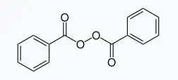BPO có cấu trúc hóa học: (C6H5−C(=O)O−)2 gồm 2 nhóm Benzoyl (C6H5−C(=O)−, Bz) kết hợp với nhau bằng một cầu nối Peroxide (−O−O−).