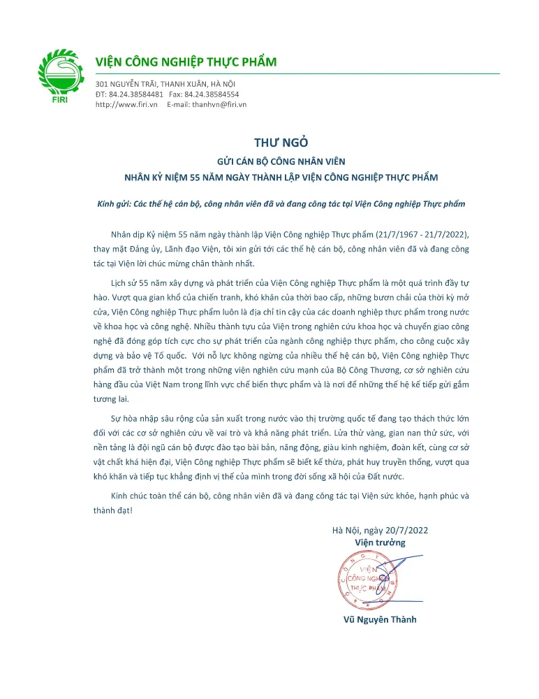 Thư Ngỏ Nhân Kỷ Niệm 55 Năm Ngày Thành Lập Viện Công Nghiệp Thực Phẩm