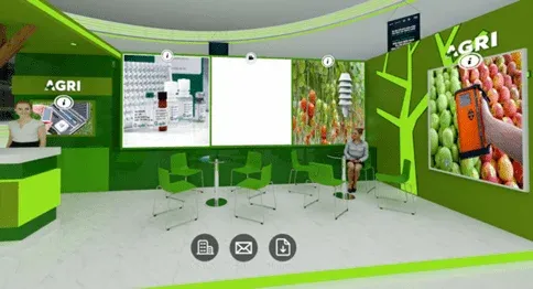 Các gian hàng được bài trí theo phong cách hiện đại với nhiều tiện tích như giới thiệu tổng quan về doanh nghiệp, gắn link website, link web VR, video/hình ảnh giới thiệu về công ty. Doanh nghiệp có thể tương tác trực tiếp với khách hàng bằng cách chat, email…