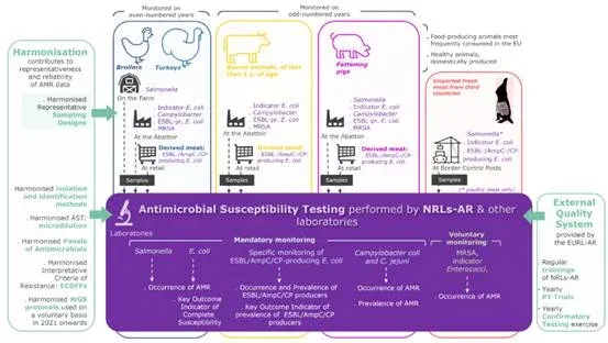 Việc thu thập và báo cáo dữ liệu được thực hiện ở cấp độ phân lập, để cho phép phân tích về sự xuất hiện và các đặc điểm của vi sinh vật kháng đa thuốc MDR (multi-drug resistance). Xét nghiệm AMR được thực hiện ở các phân lập đại diện có nguồn gốc từ việc lấy mẫu ngẫu nhiên ở động vật sản xuất thực phẩm được thực hiện tại trang trại và/hoặc lò giết mổ và ở thịt có nguồn gốc được thực hiện tại cửa hàng bán lẻ và tại các trạm kiểm soát biên giới. Việc theo dõi AMR ở các sinh vật cộng sinh và động vật lây truyền sang người tập trung vào các quần thể động vật mà người tiêu dùng có nhiều khả năng tiếp xúc nhất thông qua thực phẩm có nguồn gốc từ chúng, chẳng hạn như gia cầm tại các nước Liên minh châu Âu (chủ yếu là gà thịt và gà tây vỗ béo), lợn vỗ béo và gia súc dưới một tuổi. Các loài vi khuẩn được thử nghiệm ở động vật dùng cho thực phẩm được hiển thị trong Hình 2.